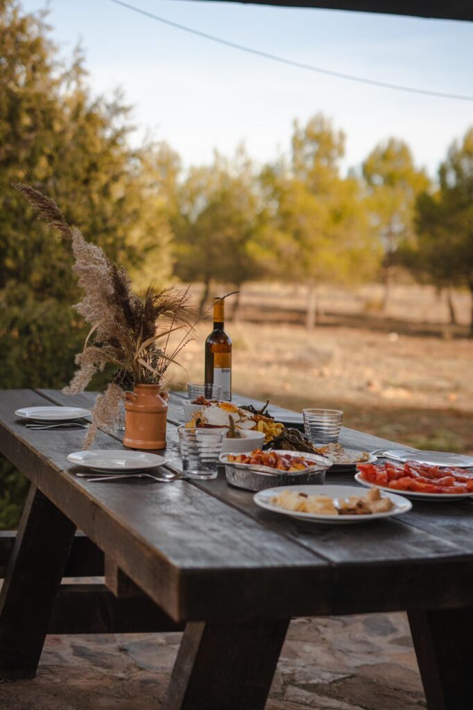 Porche con gran mesa y barbacoa, en una finca de 12 hectáreas de monte de pinos, sabinas, encinas… Frente a la Laguna Blanca.